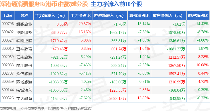 资金流向方面,深港通消费服务R(港币)(483046)指数成份股当日主力资金净流入合计1.03亿元,游资资金净流出合计1.4亿元,散户资金净流入合计3644.46万元。成份股资金流向详情见下表:
