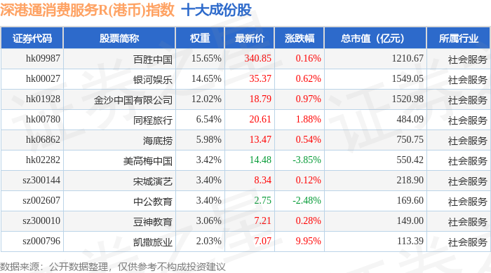 深港通消费服务R(港币)(483046)指数十大成份股详情如下:
