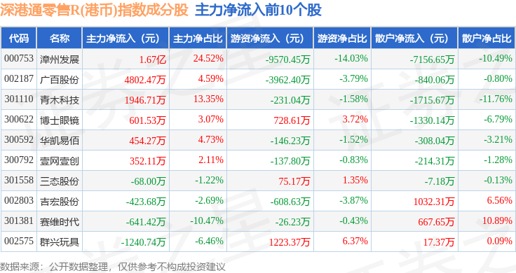 资金流向方面,深港通零售R(港币)(483074)指数成份股当日主力资金净流出合计1.58亿元,游资资金净流出合计1.0亿元,散户资金净流入合计2.59亿元。成份股资金流向详情见下表: