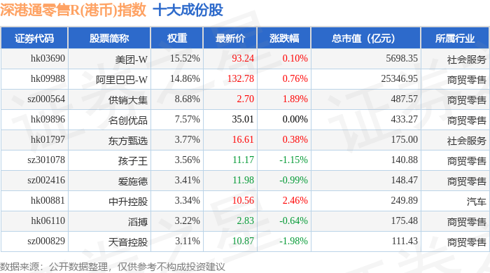 深港通零售R(港币)(483074)指数十大成份股详情如下: