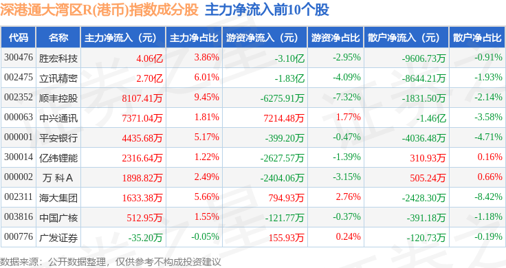 资金流向方面,深港通大湾区R(港币)(483090)指数成份股当日主力资金净流出合计6652.94万元,游资资金净流出合计1.05亿元,散户资金净流入合计1.72亿元。成份股资金流向详情见下表: