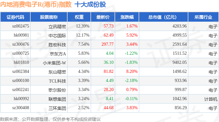 内地消费电子R(港币)(483106)指数十大成份股详情如下: