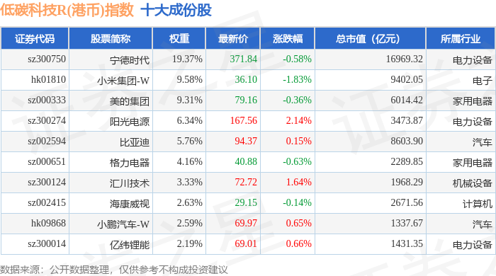 低碳科技R(港币)(483161)指数十大成份股详情如下: