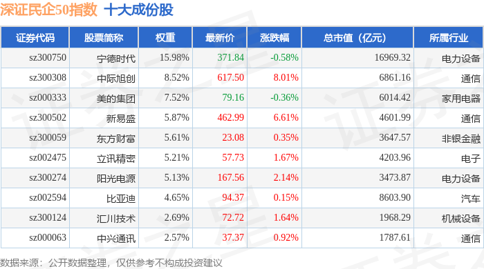 证券之星消息,12月22日,深证民企50(970057)指数报收于3430.26点,涨2.07%,成交1550.77亿元,换手率1.39%。当日该指数成份股中,上涨的有31家,菲利华以9.04%的涨幅领涨,下跌的有19家,泰格医药以1.54%的跌幅领跌。