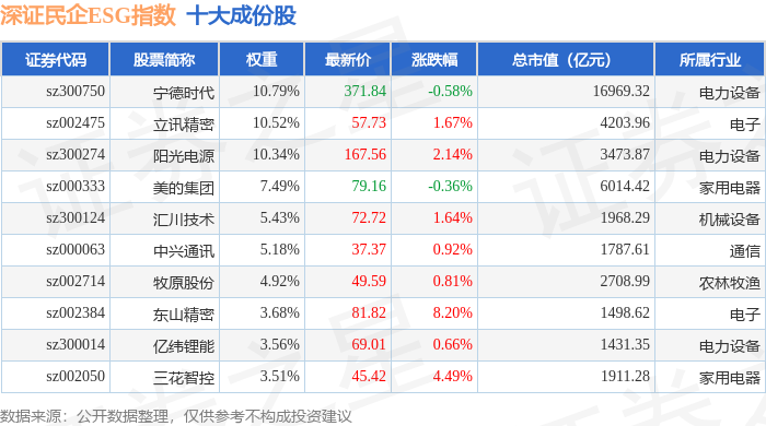 证券之星消息,12月22日,深证民企ESG(970056)指数报收于2004.11点,涨1.38%,成交823.83亿元,换手率1.94%。当日该指数成份股中,上涨的有29家,东山精密以8.2%的涨幅领涨,下跌的有20家,华利集团以2.84%的跌幅领跌。