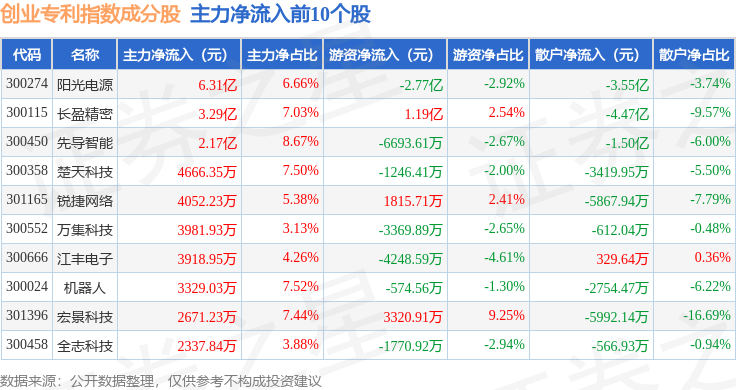 资金流向方面,创业专利(970068)指数成份股当日主力资金净流出合计5.09亿元,游资资金净流入合计3.33亿元,散户资金净流入合计1.76亿元。成份股资金流向详情见下表: