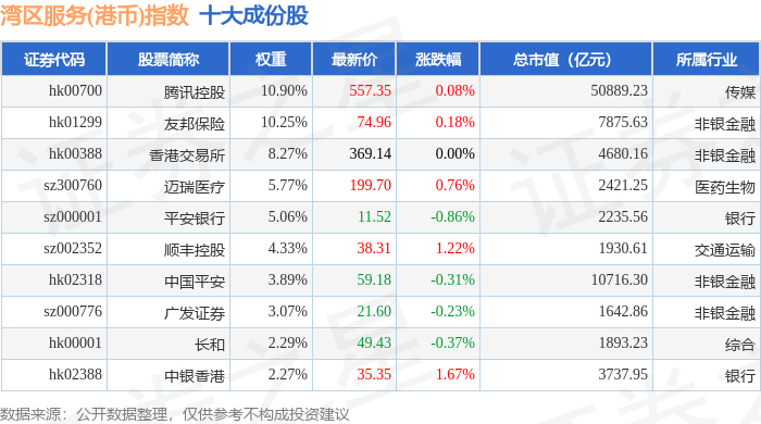 湾区服务(港币)(980012)指数十大成份股详情如下: