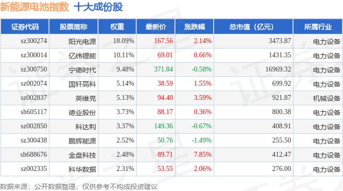 证券之星消息,12月22日,新能源电池(980027)指数报收于3350.43点,涨1.59%,成交510.27亿元,换手率2.04%。当日该指数成份股中,上涨的有38家,科士达以9.99%的涨幅领涨,下跌的有12家,永福股份以3.65%的跌幅领跌。