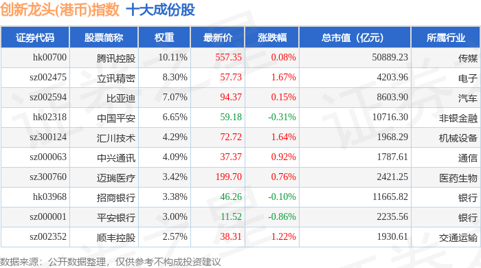 创新龙头(港币)(980037)指数十大成份股详情如下: