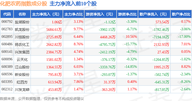 资金流向方面,化肥农药(980035)指数成份股当日主力资金净流出合计1.7亿元,游资资金净流出合计2.25亿元,散户资金净流入合计4.01亿元。成份股资金流向详情见下表: