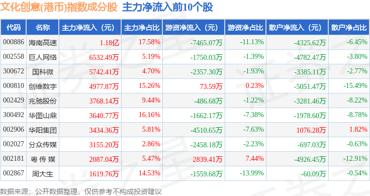 资金流向方面,文化创意(港币)(980047)指数成份股当日主力资金净流出合计14.35亿元,游资资金净流入合计4.14亿元,散户资金净流入合计10.21亿元。成份股资金流向详情见下表: