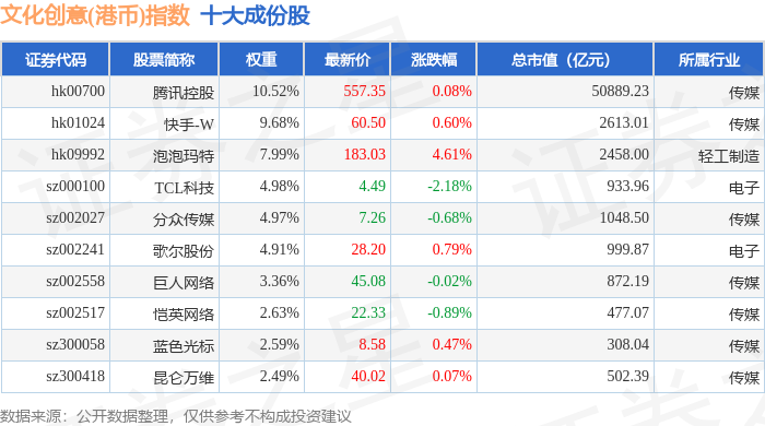 文化创意(港币)(980047)指数十大成份股详情如下: