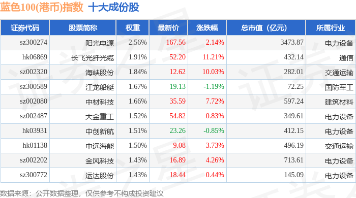 蓝色100(港币)(980069)指数十大成份股详情如下: