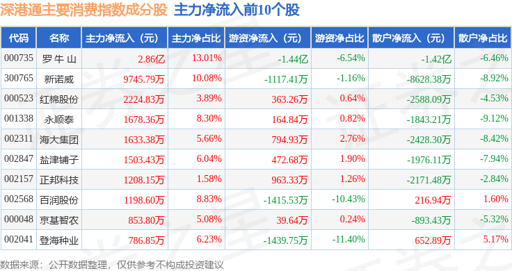 资金流向方面,深港通主要消费(983021)指数成份股当日主力资金净流出合计9.96亿元,游资资金净流入合计1.64亿元,散户资金净流入合计8.32亿元。成份股资金流向详情见下表: