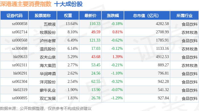 深港通主要消费(983021)指数十大成份股详情如下: