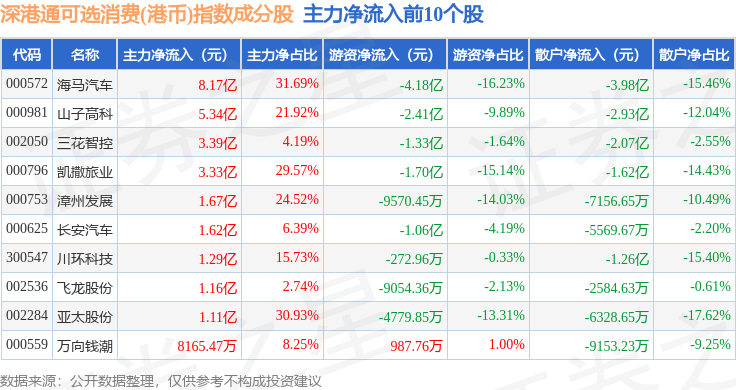 资金流向方面,深港通可选消费(港币)(983020)指数成份股当日主力资金净流出合计6.2亿元,游资资金净流出合计4.84亿元,散户资金净流入合计11.04亿元。成份股资金流向详情见下表: