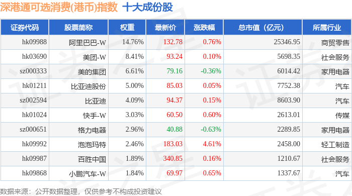 深港通可选消费(港币)(983020)指数十大成份股详情如下: