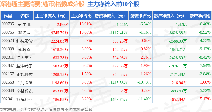 资金流向方面,深港通主要消费(港币)(983022)指数成份股当日主力资金净流出合计9.96亿元,游资资金净流入合计1.64亿元,散户资金净流入合计8.32亿元。成份股资金流向详情见下表: