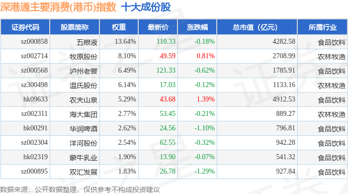 深港通主要消费(港币)(983022)指数十大成份股详情如下: