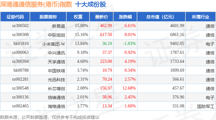 深港通通信服务(港币)(983034)指数十大成份股详情如下: