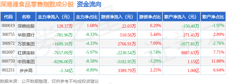 资金流向方面,深港通食品零售(983037)指数成份股当日主力资金净流出合计3.17亿元,游资资金净流入合计1275.8万元,散户资金净流入合计3.04亿元。成份股资金流向详情见下表: