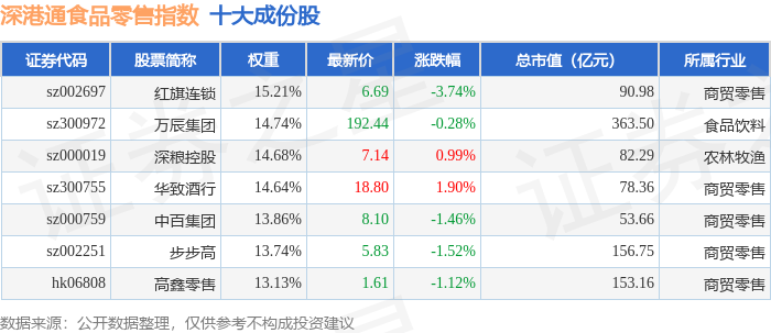 证券之星消息,12月22日,深港通食品零售(983037)指数报收于2488.23点,跌0.87%,成交43.27亿元,换手率4.08%。当日该指数成份股中,上涨的有2家,华致酒行以1.9%的涨幅领涨,下跌的有5家,红旗连锁以3.74%的跌幅领跌。