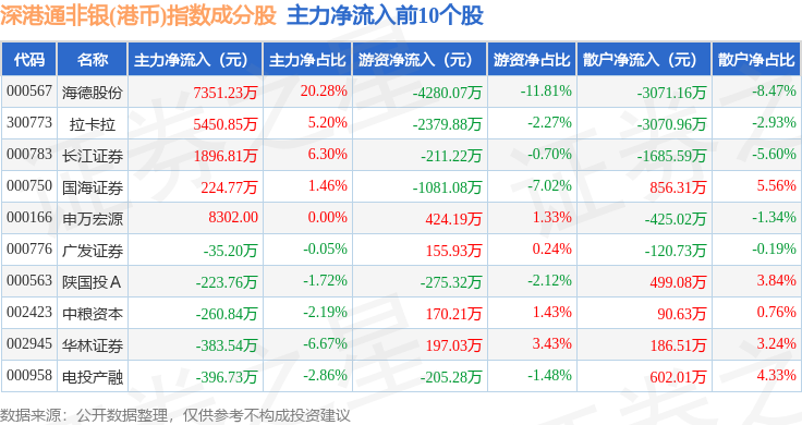 资金流向方面,深港通非银(港币)(983054)指数成份股当日主力资金净流出合计3.68亿元,游资资金净流出合计254.59万元,散户资金净流入合计3.7亿元。成份股资金流向详情见下表: