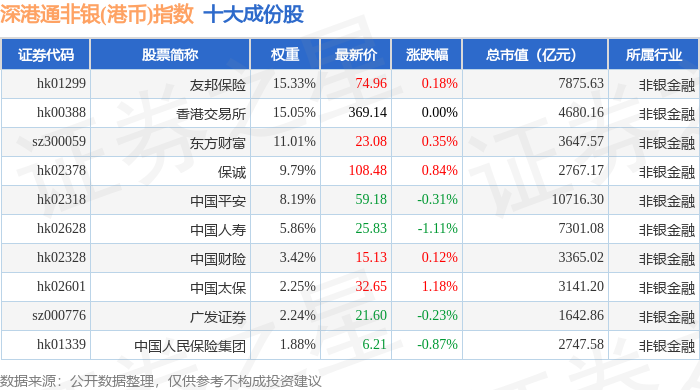 深港通非银(港币)(983054)指数十大成份股详情如下: