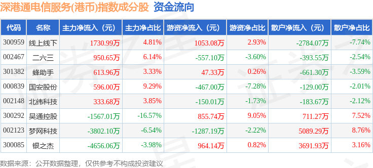 资金流向方面,深港通电信服务(港币)(983058)指数成份股当日主力资金净流出合计5799.89万元,游资资金净流入合计458.99万元,散户资金净流入合计5340.9万元。成份股资金流向详情见下表: