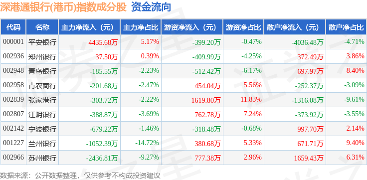 资金流向方面,深港通银行(港币)(983082)指数成份股当日主力资金净流出合计775.05万元,游资资金净流入合计2354.59万元,散户资金净流出合计1579.54万元。成份股资金流向详情见下表: