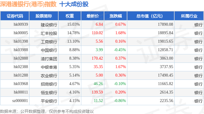深港通银行(港币)(983082)指数十大成份股详情如下: