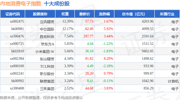 内地消费电子(983105)指数十大成份股详情如下: