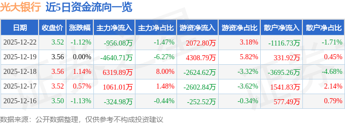 证券之星消息,截至2025年12月22日收盘,光大银行(601818)报收于3.52元,下跌1.12%,换手率0.4%,成交量184.86万手,成交额6.52亿元。