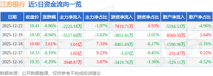 证券之星消息,截至2025年12月22日收盘,江苏银行(600919)报收于10.41元,下跌0.86%,换手率0.59%,成交量108.11万手,成交额11.28亿元。