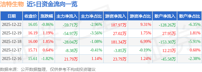 证券之星消息,截至2025年12月22日收盘,洁特生物(688026)报收于16.05元,下跌0.86%,换手率0.89%,成交量1.25万手,成交额2018.31万元。