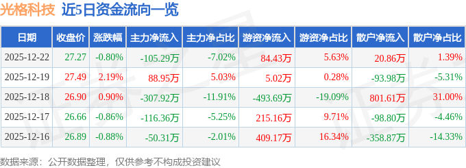 证券之星消息,截至2025年12月22日收盘,光格科技(688450)报收于27.27元,下跌0.8%,换手率1.11%,成交量5442.0手,成交额1500.14万元。