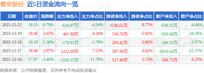 证券之星消息,截至2025年12月22日收盘,秦安股份(603758)报收于18.33元,下跌0.7%,换手率1.75%,成交量7.67万手,成交额1.42亿元。