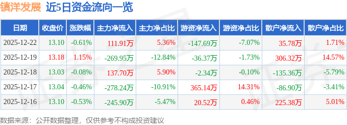 证券之星消息,截至2025年12月22日收盘,镇洋发展(603213)报收于13.1元,下跌0.61%,换手率0.36%,成交量1.59万手,成交额2087.5万元。