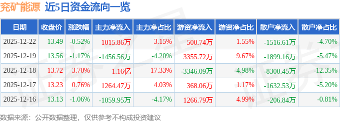 证券之星消息,截至2025年12月22日收盘,兖矿能源(600188)报收于13.49元,下跌0.52%,换手率0.41%,成交量23.99万手,成交额3.23亿元。