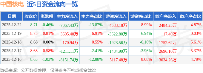 证券之星消息,截至2025年12月22日收盘,中国核电(601985)报收于8.71元,下跌0.46%,换手率0.31%,成交量58.38万手,成交额5.1亿元。