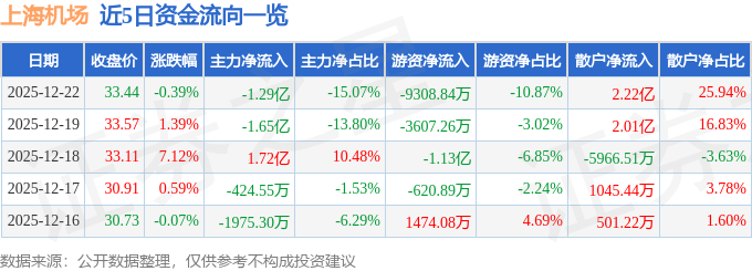 证券之星消息,截至2025年12月22日收盘,上海机场(600009)报收于33.44元,下跌0.39%,换手率1.24%,成交量25.44万手,成交额8.57亿元。