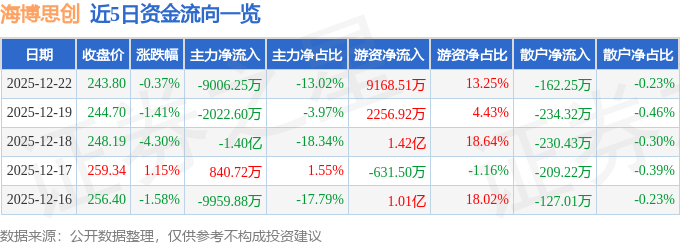 证券之星消息,截至2025年12月22日收盘,海博思创(688411)报收于243.8元,下跌0.37%,换手率7.38%,成交量2.8万手,成交额6.92亿元。