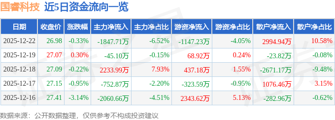 证券之星消息,截至2025年12月22日收盘,国睿科技(600562)报收于26.98元,下跌0.33%,换手率0.85%,成交量10.53万手,成交额2.83亿元。