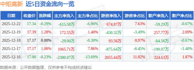 12月22日的资金流向数据方面,主力资金净流出615.58万元,占总成交额6.96%,游资资金净流入674.87万元,占总成交额7.63%,散户资金净流出59.29万元,占总成交额0.67%。