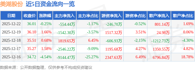 证券之星消息,截至2025年12月22日收盘,美湖股份(603319)报收于36.01元,下跌0.25%,换手率3.86%,成交量13.08万手,成交额4.75亿元。