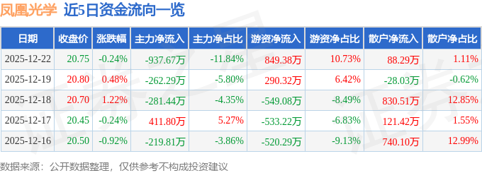 证券之星消息,截至2025年12月22日收盘,凤凰光学(600071)报收于20.75元,下跌0.24%,换手率1.35%,成交量3.8万手,成交额7918.87万元。