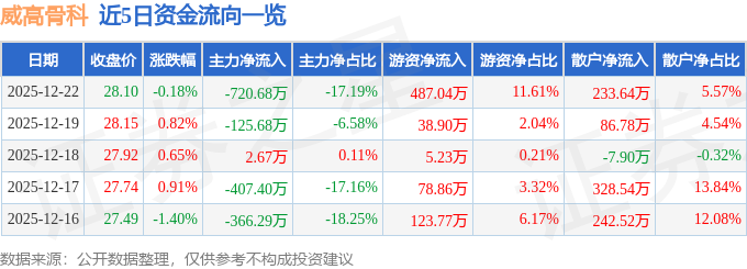 证券之星消息,截至2025年12月22日收盘,威高骨科(688161)报收于28.1元,下跌0.18%,换手率0.37%,成交量1.5万手,成交额4193.28万元。