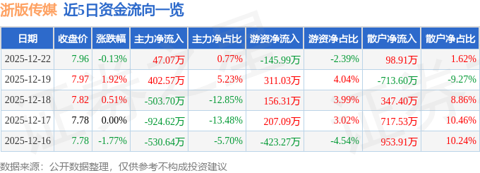 证券之星消息,截至2025年12月22日收盘,浙版传媒(601921)报收于7.96元,下跌0.13%,换手率0.35%,成交量7.67万手,成交额6102.6万元。