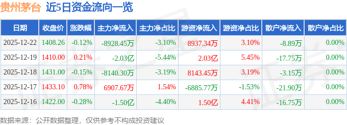 证券之星消息,截至2025年12月22日收盘,贵州茅台(600519)报收于1408.26元,下跌0.12%,换手率0.16%,成交量2.04万手,成交额28.82亿元。