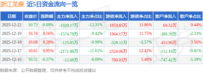 证券之星消息,截至2025年12月22日收盘,浙江龙盛(600352)报收于10.73元,下跌0.09%,换手率0.45%,成交量14.62万手,成交额1.57亿元。